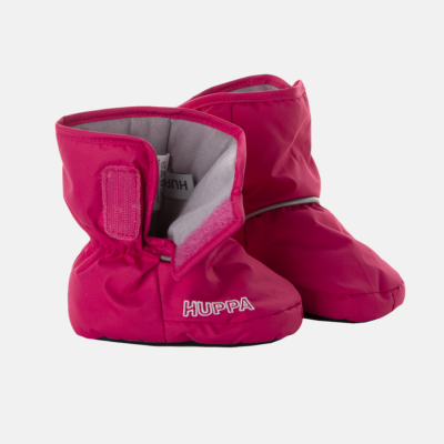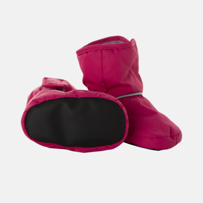 Babies’ soft waterproof and windproof lined booties. Breathable fabric. Cotton jersey inside. Reflective elements on fabric.