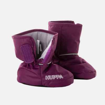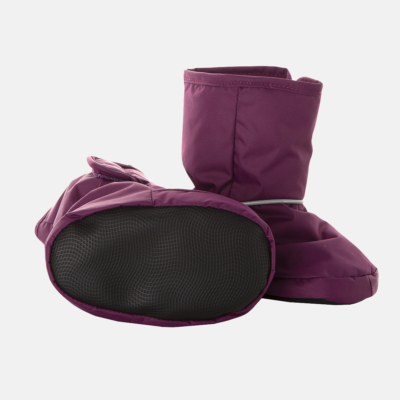 Babies’ soft waterproof and windproof lined booties. Breathable fabric. Cotton jersey inside. Reflective elements on fabric.