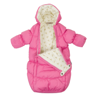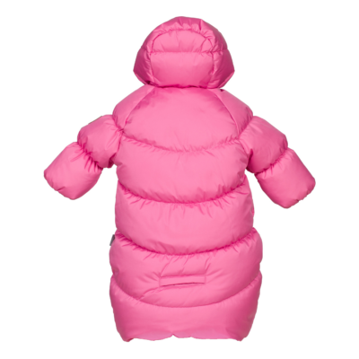 Waterproof and windproof babies’ sleeping bag. The sleeping bag is lined with soft cotton flannel and has breathable top fabric. It is easy to fit the baby into the sleeping bag thanks to the two full-length zippers, and for car rides, seat belts can conveniently be secured through the belt holes. Integrated elastic band at sleeve ends and around hood. The sleeve ends can easily be turned back and there is no need for gloves. Two long zippers at front.