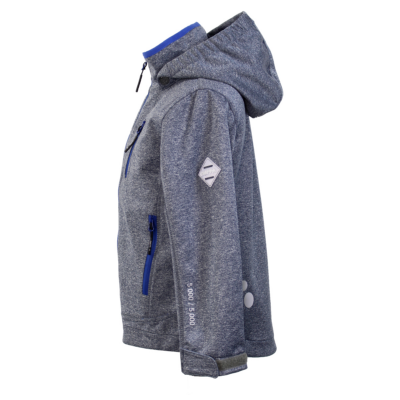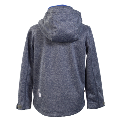 Boys´ windproof Softshell jacket. The jacket has an inner lining made of a brushed soft material. It has an elasticated, detachable hood that can be attached to the collar with snap fasteners. The jacket has adjustable sleeves.