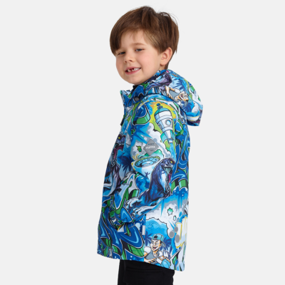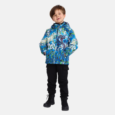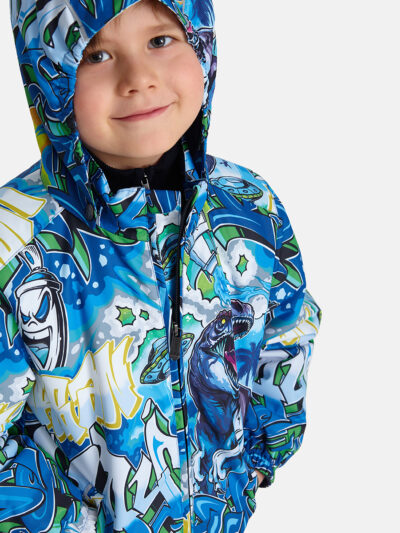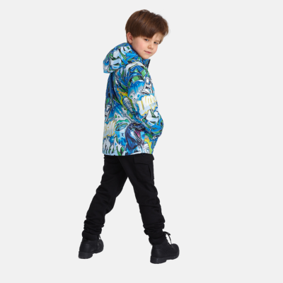 Insulated (100 g) water- and windproof jacket for boys, suitable for spring and autumn. The top layer of the jacket is made of a breathable material. The detachable hood can be attached to the collar with snap fasteners. The jacket has elasticated sleeve cuffs and hood. It is decorated with reflective details.