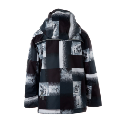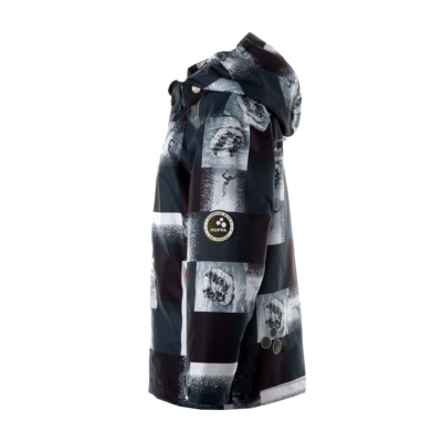 Children´s waterproof and windproof spring-autumn jacket. Breathable outer fabric. Rubber band incorporated at the edge of the hood. The removable hood attaches to the collar with press studs. Adjustable sleeve ends. Zipper fastener. Incorporated pockets on the front. Rubber band tunnel with stoppers incorporated at the bottom. Reflective details on the outer fabric.