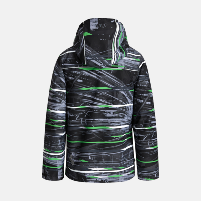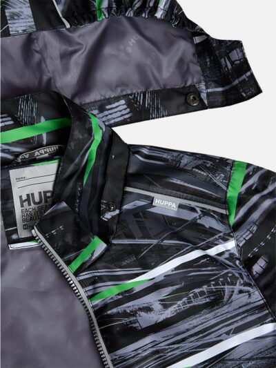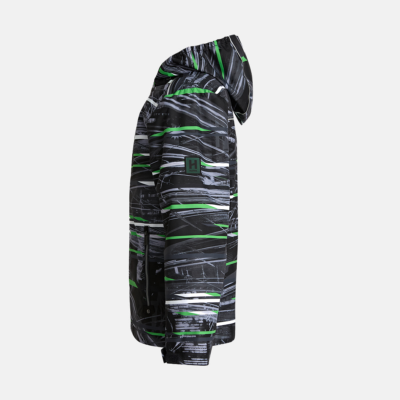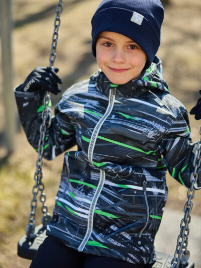 Children´s waterproof and windproof spring-autumn jacket. Breathable outer fabric. Rubber band incorporated at the edge of the hood. The removable hood attaches to the collar with press studs. Adjustable sleeve ends. Zipper fastener. Incorporated pockets on the front. Rubber band tunnel with stoppers incorporated at the bottom. Reflective details on the outer fabric.