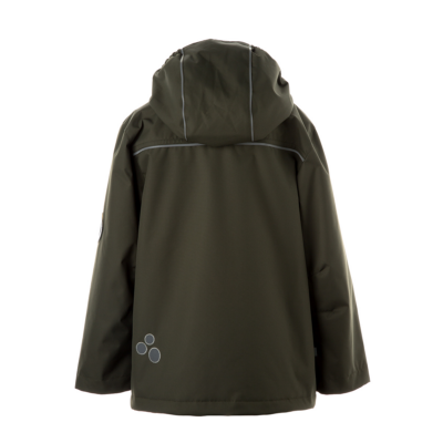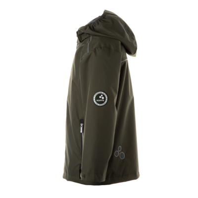 Children´s waterproof and windproof spring-autumn jacket. Breathable outer fabric. Rubber band incorporated at the edge of the hood. The removable hood attaches to the collar with press studs. Adjustable sleeve ends. Zipper fastener. Incorporated pockets on the front. Rubber band tunnel with stoppers incorporated at the bottom. Reflective details on the outer fabric.