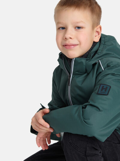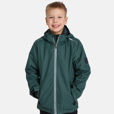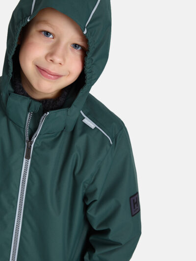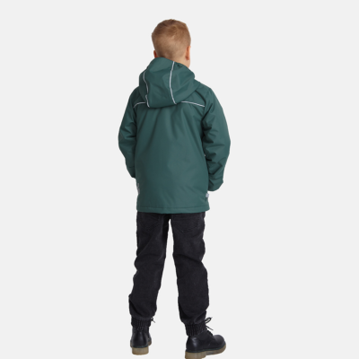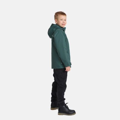 Children´s waterproof and windproof spring-autumn jacket. Breathable outer fabric. Rubber band incorporated at the edge of the hood. The removable hood attaches to the collar with press studs. Adjustable sleeve ends. Zipper fastener. Incorporated pockets on the front. Rubber band tunnel with stoppers incorporated at the bottom. Reflective details on the outer fabric.