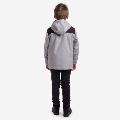 Children´s waterproof and windproof spring-autumn jacket. Breathable outer fabric. Rubber band incorporated at the edge of the hood. The removable hood attaches to the collar with press studs. Adjustable sleeve ends. Zipper fastener. Incorporated pockets on the front. Rubber band tunnel with stoppers incorporated at the bottom. Reflective details on the outer fabric.