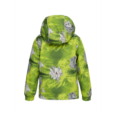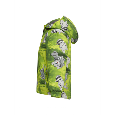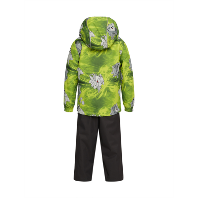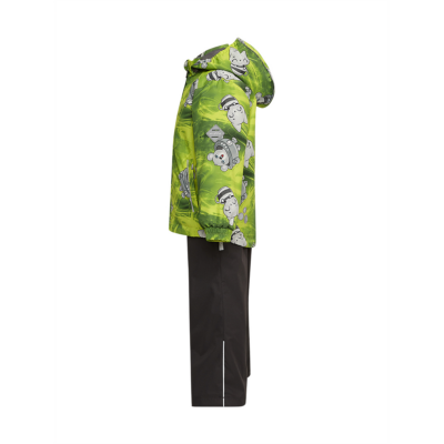 Children´s transition season jacket and pants set. Water- and windproof, breathable outer fabric. The inside of the jacket and trousers is made of soft lining fabric. Rubber band incorporated in the sleeve ends and the edge of the hood. The removable hood attaches to the collar with press studs. The trousers have a higher waist and adjustable elastic braces. incorporated rubber waistband. Rubber band tunnel with stoppers at the ends of the legs. Waterproof taped seat seam. The pants have no inseam on the leg. Both jackets and trousers have reflective details.