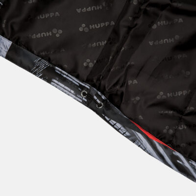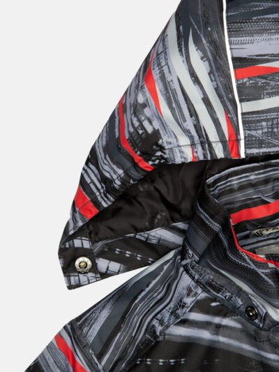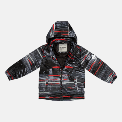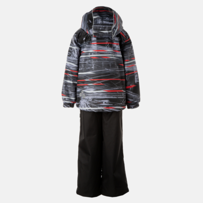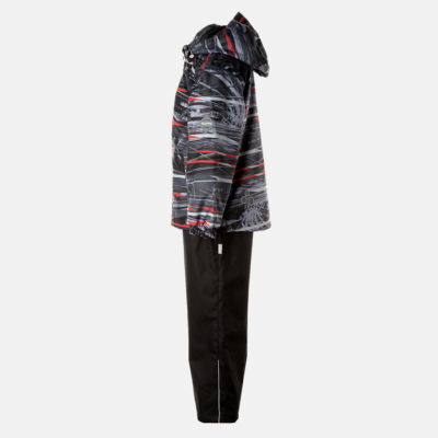 Children´s transition season jacket and pants set. Water- and windproof, breathable outer fabric. The inside of the jacket and trousers is made of soft lining fabric. Rubber band incorporated in the sleeve ends and the edge of the hood. The removable hood attaches to the collar with press studs. The trousers have a higher waist and adjustable elastic braces. incorporated rubber waistband. Rubber band tunnel with stoppers at the ends of the legs. Waterproof taped seat seam. The pants have no inseam on the leg. Both jackets and trousers have reflective details.