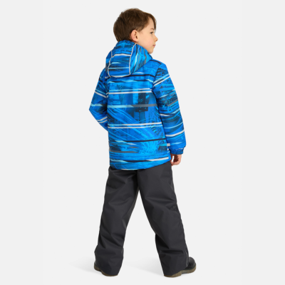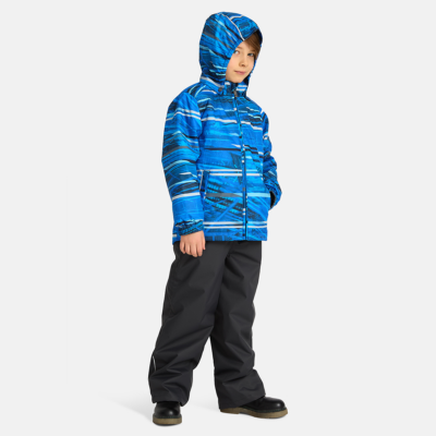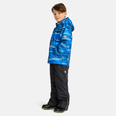 Children´s transition season jacket and pants set. Water- and windproof, breathable outer fabric. The inside of the jacket and trousers is made of soft lining fabric. Rubber band incorporated in the sleeve ends and the edge of the hood. The removable hood attaches to the collar with press studs. The trousers have a higher waist and adjustable elastic braces. incorporated rubber waistband. Rubber band tunnel with stoppers at the ends of the legs. Waterproof taped seat seam. The pants have no inseam on the leg. Both jackets and trousers have reflective details.