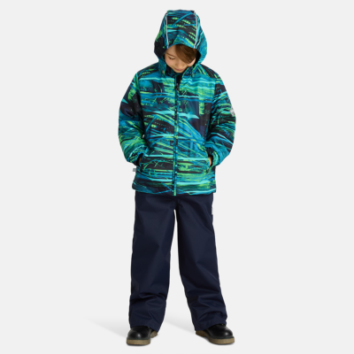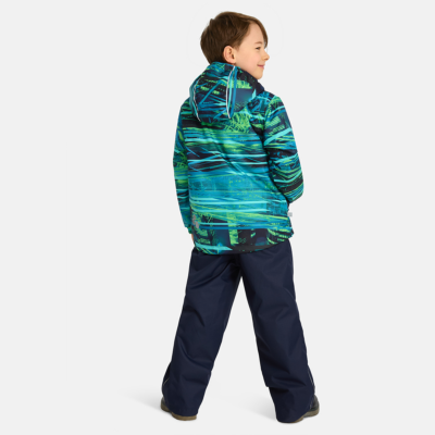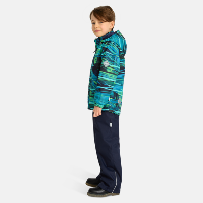 Children´s transition season jacket and pants set. Water- and windproof, breathable outer fabric. The inside of the jacket and trousers is made of soft lining fabric. Rubber band incorporated in the sleeve ends and the edge of the hood. The removable hood attaches to the collar with press studs. The trousers have a higher waist and adjustable elastic braces. incorporated rubber waistband. Rubber band tunnel with stoppers at the ends of the legs. Waterproof taped seat seam. The pants have no inseam on the leg. Both jackets and trousers have reflective details.