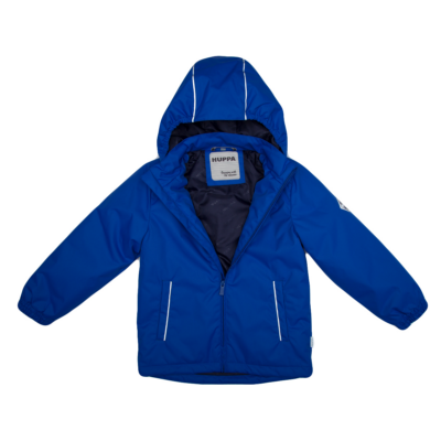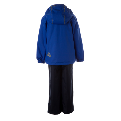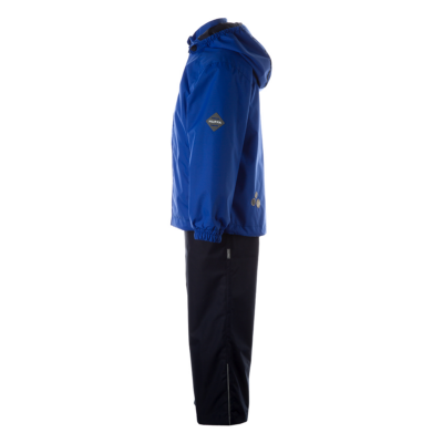 Children´s transition season jacket and pants set. Water- and windproof, breathable outer fabric. The inside of the jacket and trousers is made of soft lining fabric. Rubber band incorporated in the sleeve ends and the edge of the hood. The removable hood attaches to the collar with press studs. The trousers have a higher waist and adjustable elastic braces. incorporated rubber waistband. Rubber band tunnel with stoppers at the ends of the legs. Waterproof taped seat seam. The pants have no inseam on the leg. Both jackets and trousers have reflective details.