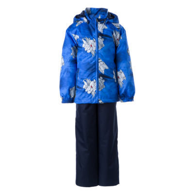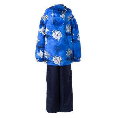 Children´s transition season jacket and pants set. Water- and windproof, breathable outer fabric. The inside of the jacket and trousers is made of soft lining fabric. Rubber band incorporated in the sleeve ends and the edge of the hood. The removable hood attaches to the collar with press studs. The trousers have a higher waist and adjustable elastic braces. incorporated rubber waistband. Rubber band tunnel with stoppers at the ends of the legs. Waterproof taped seat seam. The pants have no inseam on the leg. Both jackets and trousers have reflective details.
