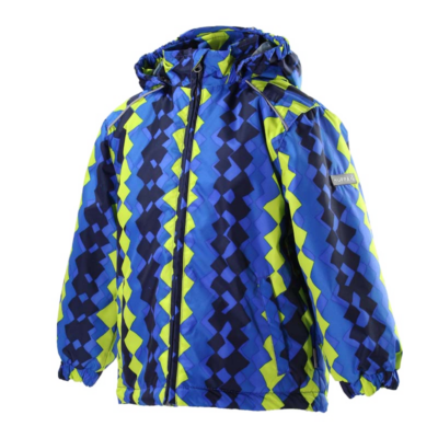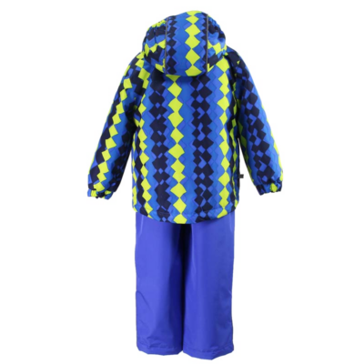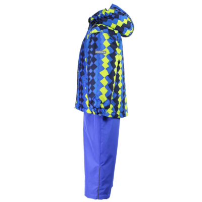 Children´s transition season jacket and pants set. Water- and windproof, breathable outer fabric. The inside of the jacket and trousers is made of soft lining fabric. Rubber band incorporated in the sleeve ends and the edge of the hood. The removable hood attaches to the collar with press studs. The trousers have a higher waist and adjustable elastic braces. incorporated rubber waistband. Rubber band tunnel with stoppers at the ends of the legs. Waterproof taped seat seam. The pants have no inseam on the leg. Both jackets and trousers have reflective details.