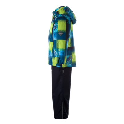 Children´s transition season jacket and pants set. Water- and windproof, breathable outer fabric. The inside of the jacket and trousers is made of soft lining fabric. Rubber band incorporated in the sleeve ends and the edge of the hood. The removable hood attaches to the collar with press studs. The trousers have a higher waist and adjustable elastic braces. incorporated rubber waistband. Rubber band tunnel with stoppers at the ends of the legs. Waterproof taped seat seam. The pants have no inseam on the leg. Both jackets and trousers have reflective details.
