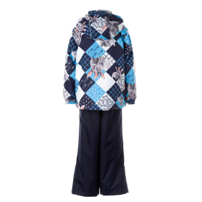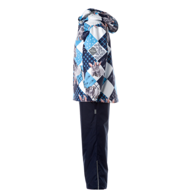 Children´s transition season jacket and pants set. Water- and windproof, breathable outer fabric. The inside of the jacket and trousers is made of soft lining fabric. Rubber band incorporated in the sleeve ends and the edge of the hood. The removable hood attaches to the collar with press studs. The trousers have a higher waist and adjustable elastic braces. incorporated rubber waistband. Rubber band tunnel with stoppers at the ends of the legs. Waterproof taped seat seam. The pants have no inseam on the leg. Both jackets and trousers have reflective details.