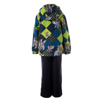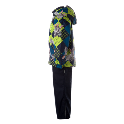 Children´s transition season jacket and pants set. Water- and windproof, breathable outer fabric. The inside of the jacket and trousers is made of soft lining fabric. Rubber band incorporated in the sleeve ends and the edge of the hood. The removable hood attaches to the collar with press studs. The trousers have a higher waist and adjustable elastic braces. incorporated rubber waistband. Rubber band tunnel with stoppers at the ends of the legs. Waterproof taped seat seam. The pants have no inseam on the leg. Both jackets and trousers have reflective details.