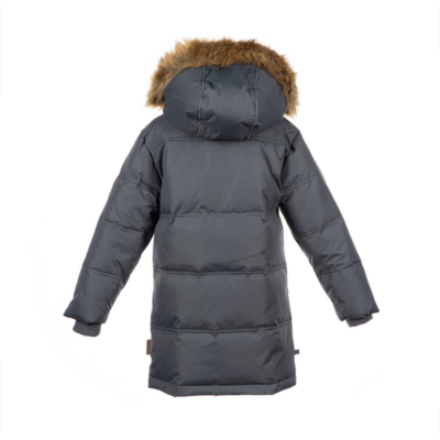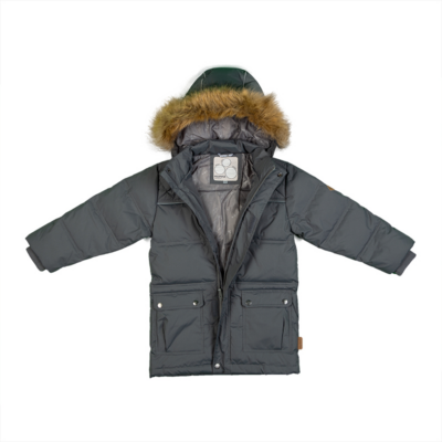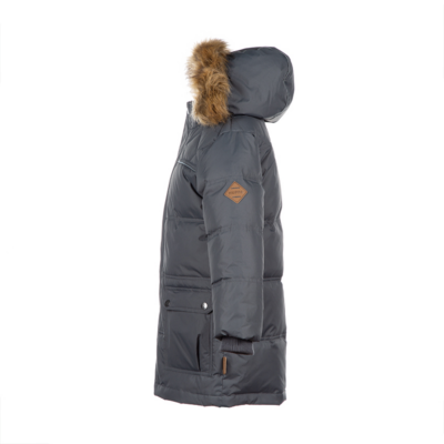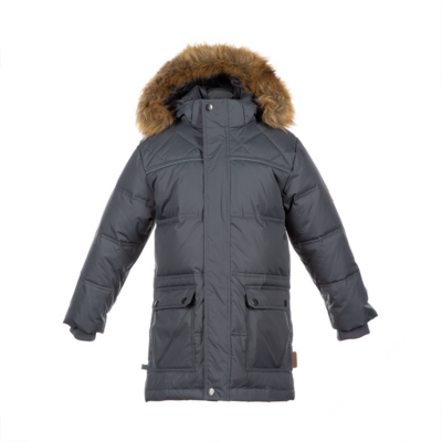Boys´ down parka. The parka´s outer fabric is wind and water resistant and has a taffeta lining. The parka is filled with 50% feather and 50% down. Ribbed inner cuffs in the sleeves and an adjustable waist keep you warm and dry. The outer fabric has reflective details. The removable hood is attached to the collar with snaps and its natural fur trim is also removable. The parka´s zipper opens from both the top and bottom, and the pockets have a zipper and snaps.