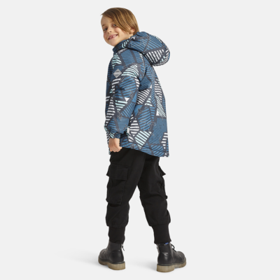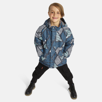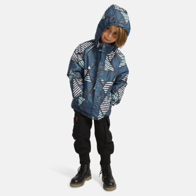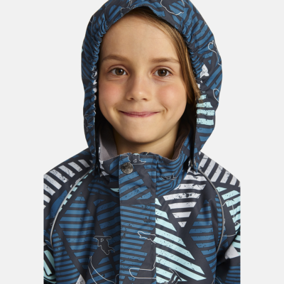 Children’s waterproof and windproof jacket. Breathable fabric. Soft mesh lining on the inside. Removable snap-on hood Integrated elastic band at sleeve ends. Zipper covered with stud-press flap at front. Integrated pockets at front. Reflective elements on fabric.