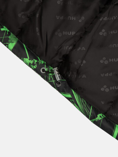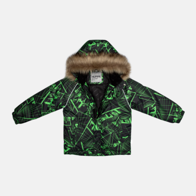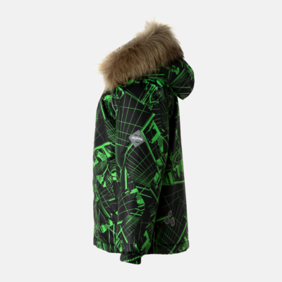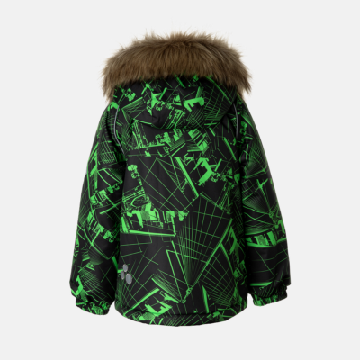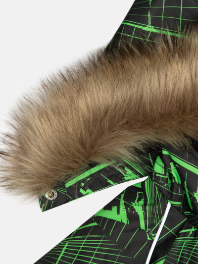 Children’s waterproof and windproof jacket. Breathable fabric. Soft mesh lining on the inside. Removable snap-on hood Integrated elastic band at sleeve ends. Zipper covered with stud-press flap at front. Integrated pockets at front. Faux fur trim on hood. Reflective elements on fabric.