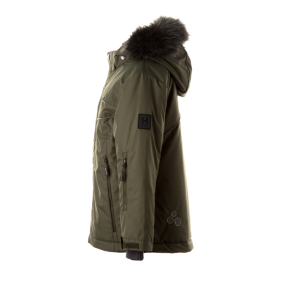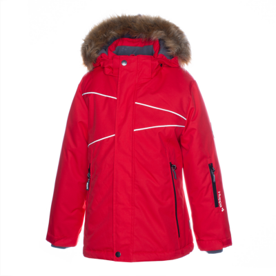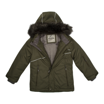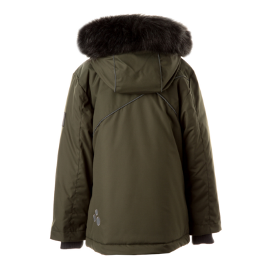 Children’s waterproof and windproof jacket. Breathable fabric. Soft mesh lining on the inside. Removable snap-on hood. Ribbed cuffs at sleeve ends. Adjustable sleeve ends. Lapped zipper at front Integrated zipper pockets at front. Waterproof taped seams. Removable faux fur trim on hood. Reflective elements on fabric.