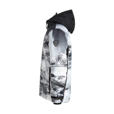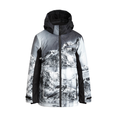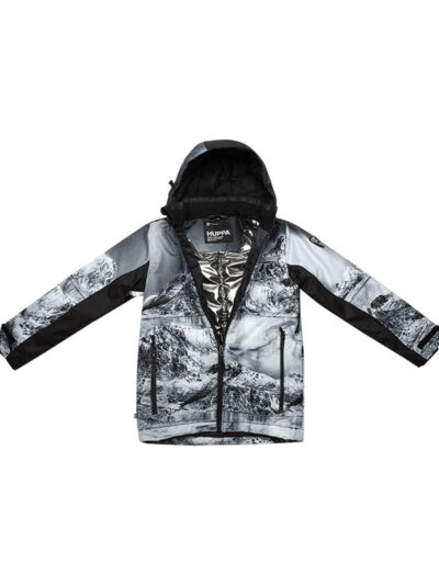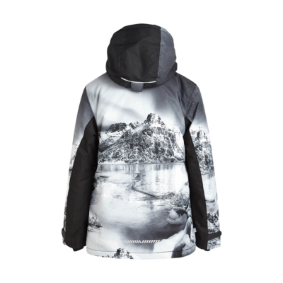 Children’s waterproof and windproof jacket. Breathable fabric. Soft mesh lining on the inside. Integrated adjustable elastic band around the hood and on the back. Waterproof zipper at front, zippered pockets. Adjustable sleeve ends. Cuffs with thumb holes at sleeve ends. Waterproof taped seams. Reflective elements on fabric.