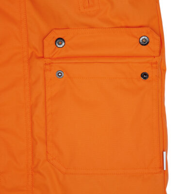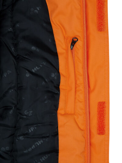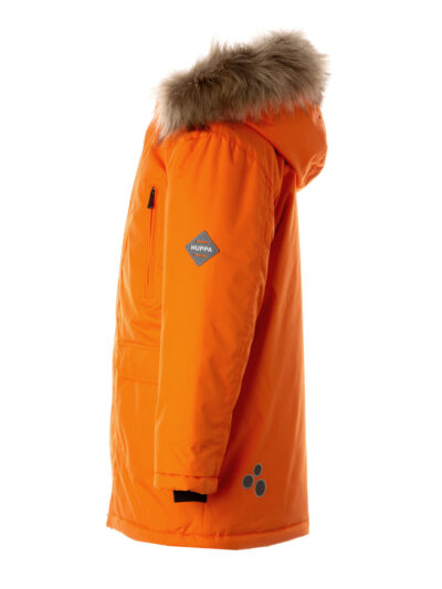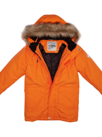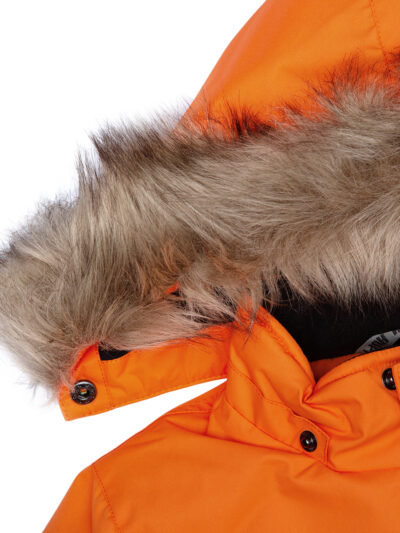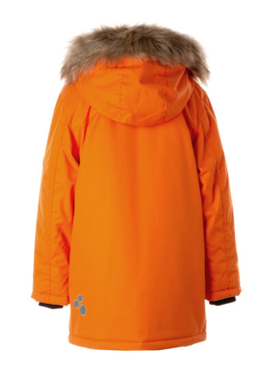 Boys’ water- and windproof winter parka with 300 g insulation. Breathable outer fabric. Detachable hood fastens to the collar with snap buttons. Ribbed cuffs on sleeves. Waterproof taped seams. Reflective detailing on outer fabric.
