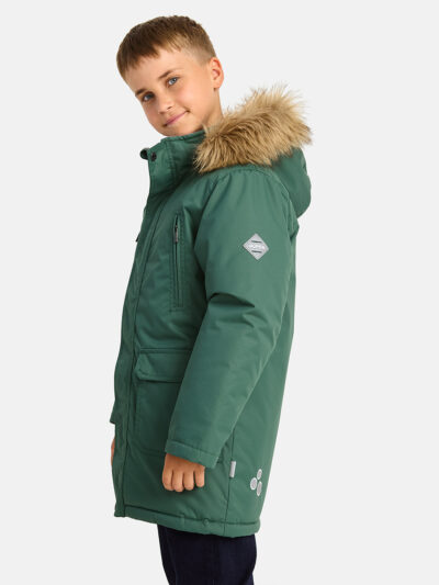 Boys’ water- and windproof winter parka with 300 g insulation. Breathable outer fabric. Detachable hood fastens to the collar with snap buttons. Ribbed cuffs on sleeves. Waterproof taped seams. Reflective detailing on outer fabric.