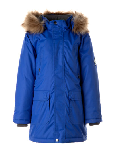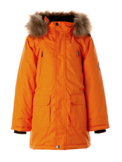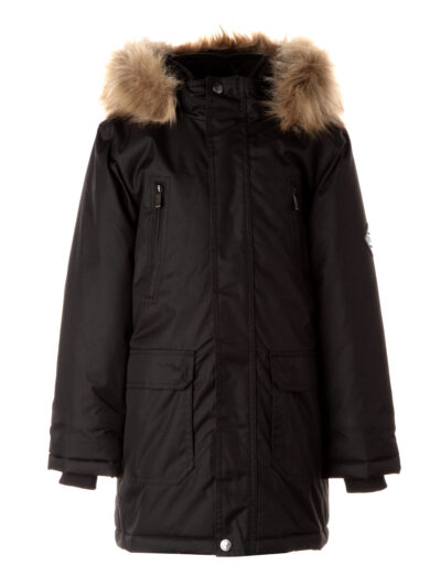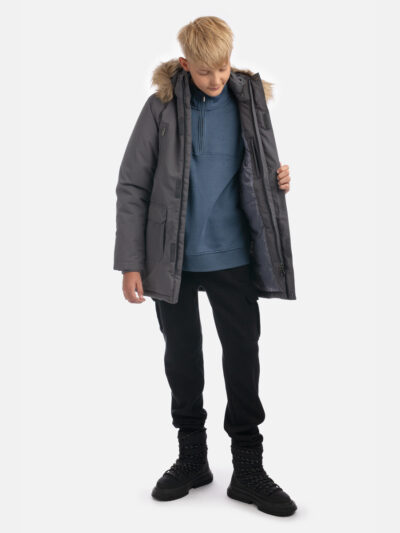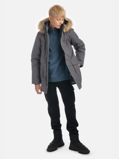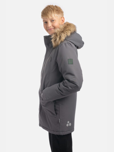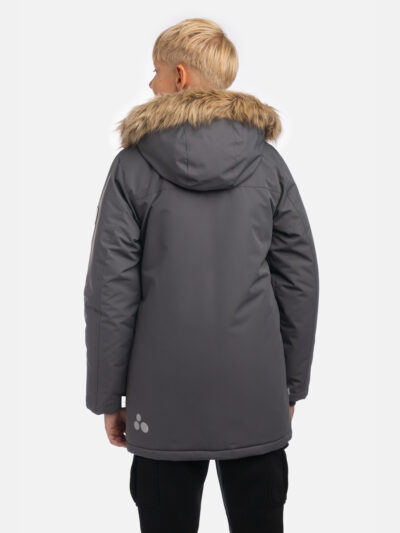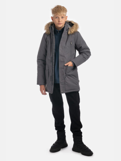 Boys’ water- and windproof winter parka with 300 g insulation. Breathable outer fabric. Detachable hood fastens to the collar with snap buttons. Ribbed cuffs on sleeves. Waterproof taped seams. Reflective detailing on outer fabric.