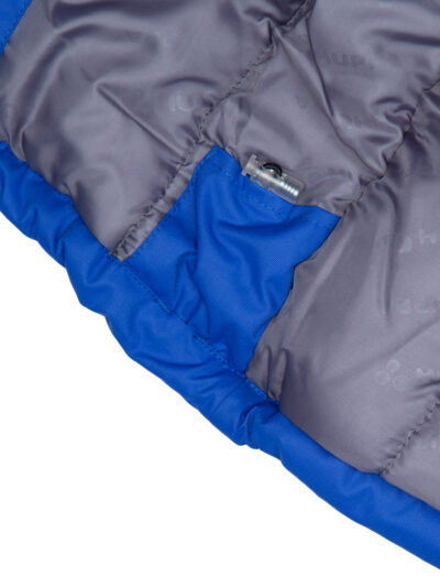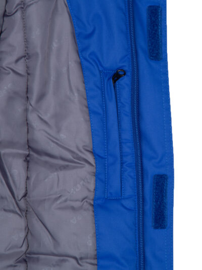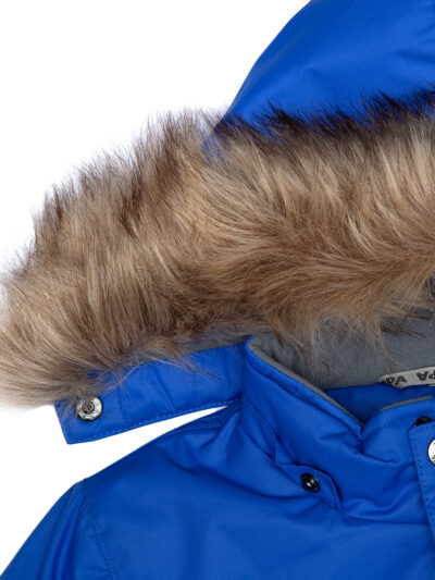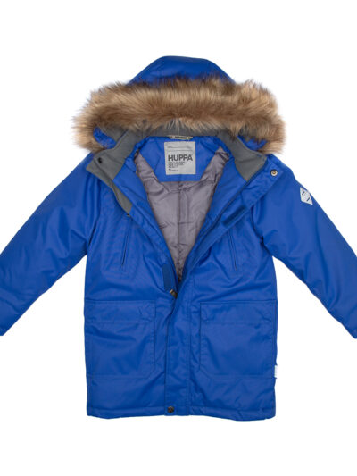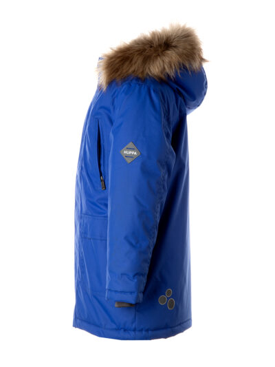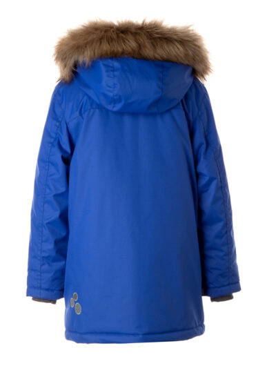 Boys’ water- and windproof winter parka with 300 g insulation. Breathable outer fabric. Detachable hood fastens to the collar with snap buttons. Ribbed cuffs on sleeves. Waterproof taped seams. Reflective detailing on outer fabric.
