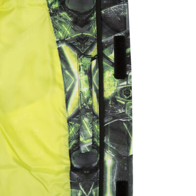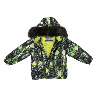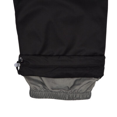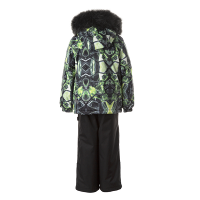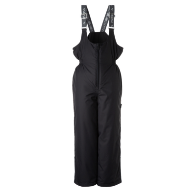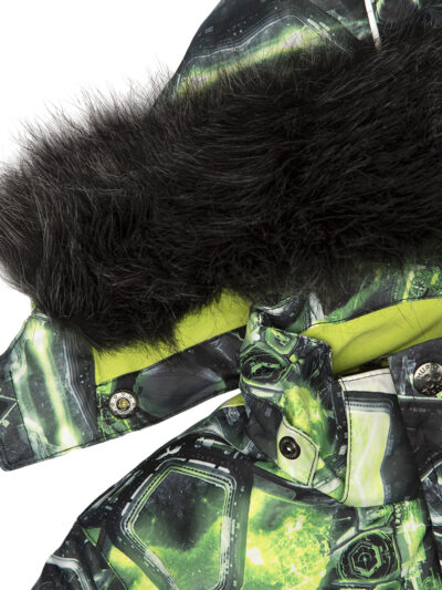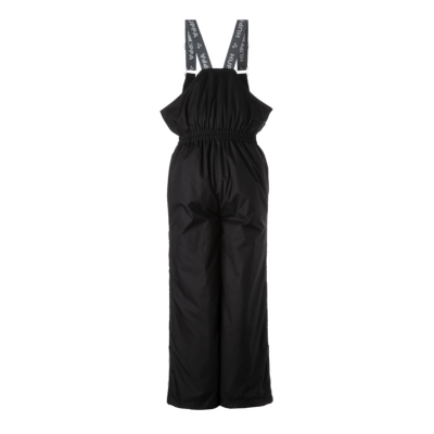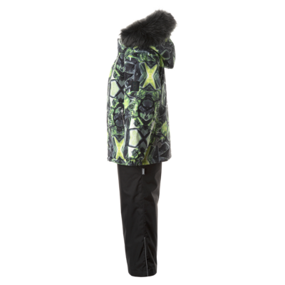 Children’s jacket and trousers set. Water- and windproof, breathable outer fabric. Inside of jacket and trousers in soft lining fabric. Elastic cuffs on ends of sleeves. Detachable hood fastens to the collar with snap buttons. Detachable faux fur trim on hood. Trousers have higher waist and adjustable elastic suspenders. Elastic waistband. Snow locks at leg ends. Rubber cord tunnel with stoppers at leg ends. Waterproof taped seams. Trousers have no inseam in leg part. Both jacket and trousers have reflective details.