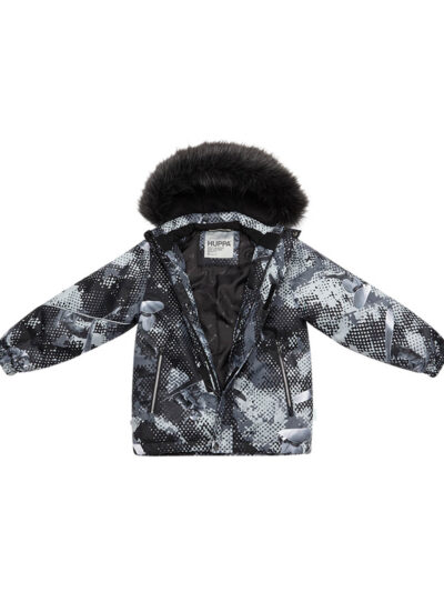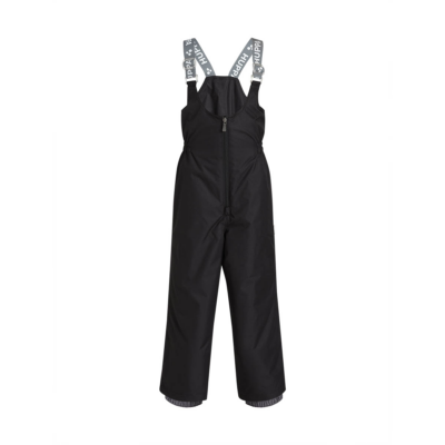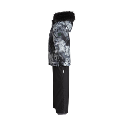 Children’s jacket and trousers set. Water- and windproof, breathable outer fabric. Inside of jacket and trousers in soft lining fabric. Elastic cuffs on ends of sleeves. Detachable hood fastens to the collar with snap buttons. Detachable faux fur trim on hood. Trousers have higher waist and adjustable elastic suspenders. Elastic waistband. Snow locks at leg ends. Rubber cord tunnel with stoppers at leg ends. Waterproof taped seams. Trousers have no inseam in leg part. Both jacket and trousers have reflective details.