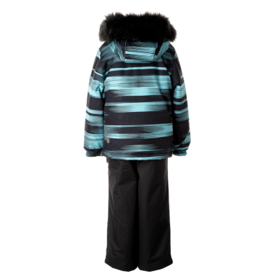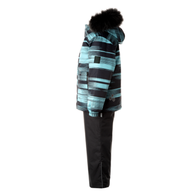 Children’s jacket and trousers set. Water- and windproof, breathable outer fabric. Inside of jacket and trousers in soft lining fabric. Elastic cuffs on ends of sleeves. Detachable hood fastens to the collar with snap buttons. Detachable faux fur trim on hood. Trousers have higher waist and adjustable elastic suspenders. Elastic waistband. Snow locks at leg ends. Rubber cord tunnel with stoppers at leg ends. Waterproof taped seams. Trousers have no inseam in leg part. Both jacket and trousers have reflective details.