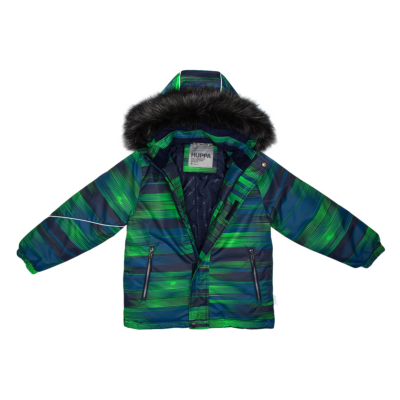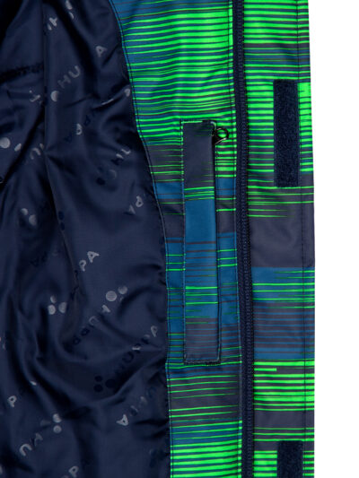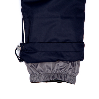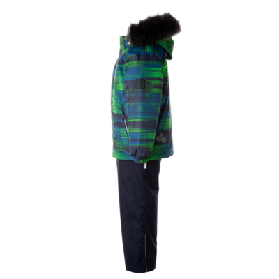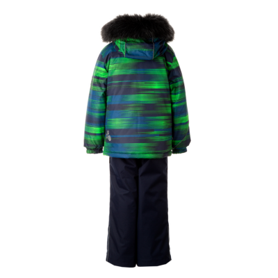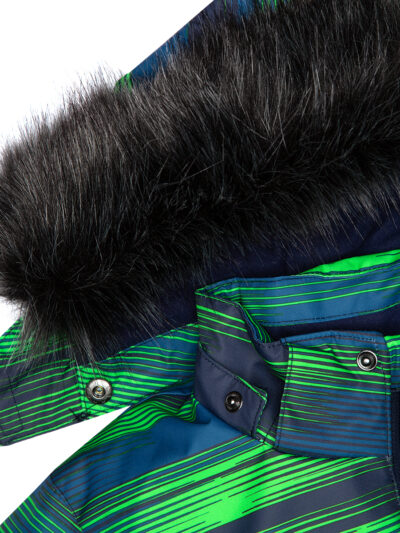 Children’s jacket and trousers set. Water- and windproof, breathable outer fabric. Inside of jacket and trousers in soft lining fabric. Elastic cuffs on ends of sleeves. Detachable hood fastens to the collar with snap buttons. Detachable faux fur trim on hood. Trousers have higher waist and adjustable elastic suspenders. Elastic waistband. Snow locks at leg ends. Rubber cord tunnel with stoppers at leg ends. Waterproof taped seams. Trousers have no inseam in leg part. Both jacket and trousers have reflective details.