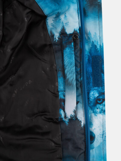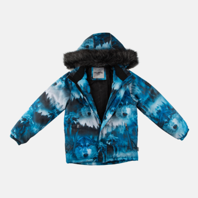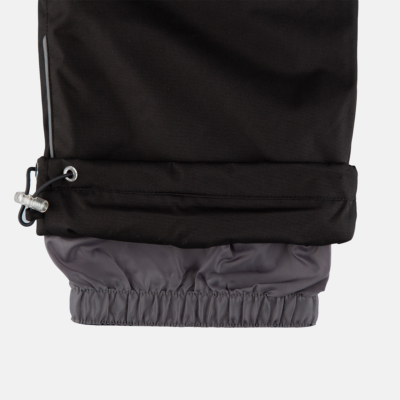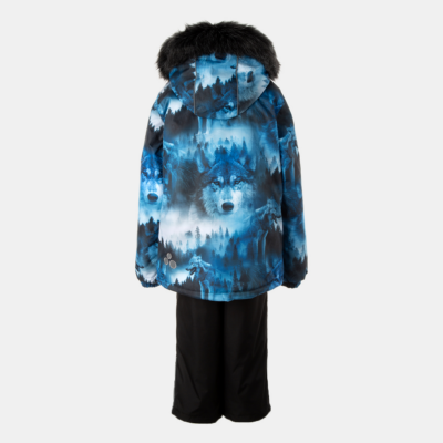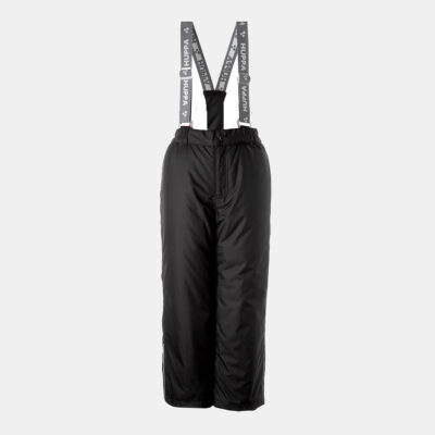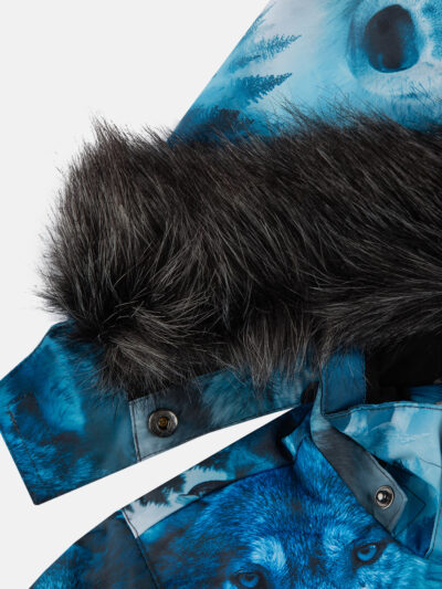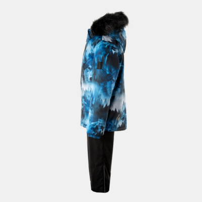 Children’s jacket and trousers set. Water- and windproof, breathable outer fabric. Inside of jacket and trousers in soft lining fabric. Elastic cuffs on ends of sleeves. Detachable hood fastens to the collar with snap buttons. Detachable faux fur trim on hood. Trousers have higher waist and adjustable elastic suspenders. Elastic waistband. Snow locks at leg ends. Rubber cord tunnel with stoppers at leg ends. Waterproof taped seams. Trousers have no inseam in leg part. Both jacket and trousers have reflective details.