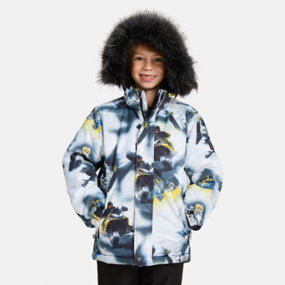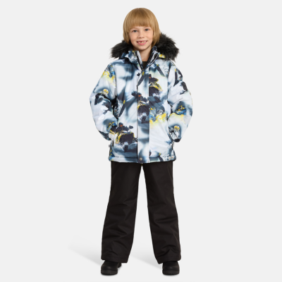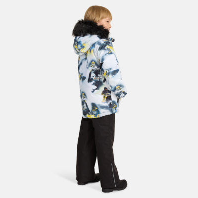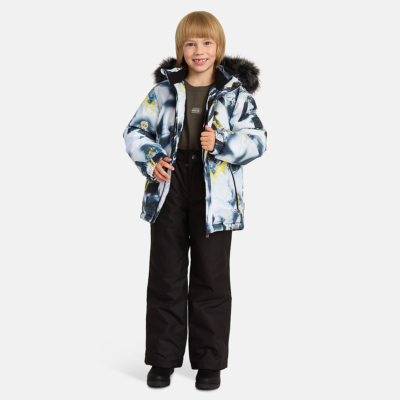 Children’s winter set with jacket and trousers. Water- and windproof, breathable outer fabric. Inside of jacket and trousers in soft lining fabric. The jacket has 300 g of insulation and the trousers have 160 g. Elastic cuffs on ends of sleeves. Detachable hood fastens to the collar with snap buttons. Detachable faux fur trim on hood. The trousers have detachable adjustable elastic suspenders. Elastic waistband. Snow locks at leg ends. Rubber cord tunnel with stoppers at leg ends. Waterproof taped seams. Both jacket and trousers have reflective details.