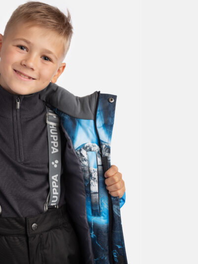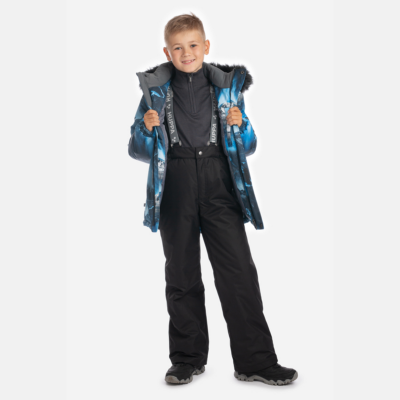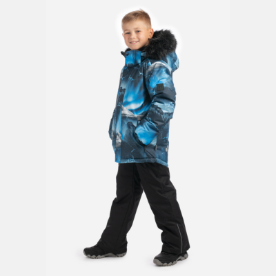 Children’s winter set with jacket and trousers. Water- and windproof, breathable outer fabric. Inside of jacket and trousers in soft lining fabric. The jacket has 300 g of insulation and the trousers have 160 g. Elastic cuffs on ends of sleeves. Detachable hood fastens to the collar with snap buttons. Detachable faux fur trim on hood. The trousers have detachable adjustable elastic suspenders. Elastic waistband. Snow locks at leg ends. Rubber cord tunnel with stoppers at leg ends. Waterproof taped seams. Both jacket and trousers have reflective details.