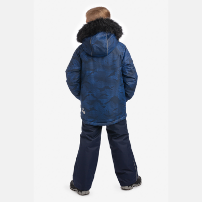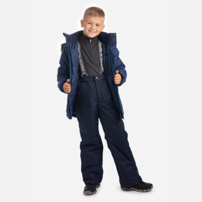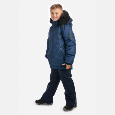 Children’s winter set with jacket and trousers. Water- and windproof, breathable outer fabric. Inside of jacket and trousers in soft lining fabric. The jacket has 300 g of insulation and the trousers have 160 g. Elastic cuffs on ends of sleeves. Detachable hood fastens to the collar with snap buttons. Detachable faux fur trim on hood. The trousers have detachable adjustable elastic suspenders. Elastic waistband. Snow locks at leg ends. Rubber cord tunnel with stoppers at leg ends. Waterproof taped seams. Both jacket and trousers have reflective details.