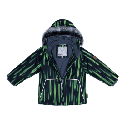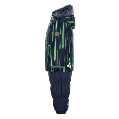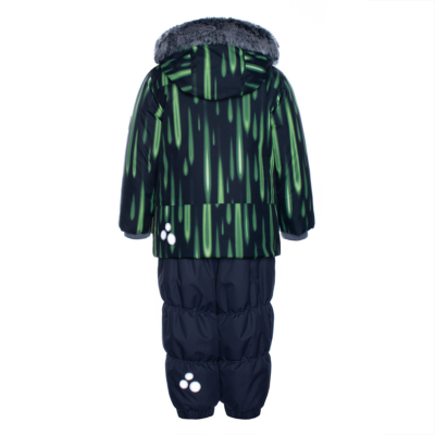 Boys´ winter set. The lining of the set is cotton flannel and the outer fabric is wind and waterproof. The jacket has 300g of insulation and the pants have 160g. Taped seams, elasticated bottoms on the pants and ribbed inner cuffs on the jacket sleeves keep the child warm and dry. The set has reflective details. The removable hood is attached to the collar with snaps.