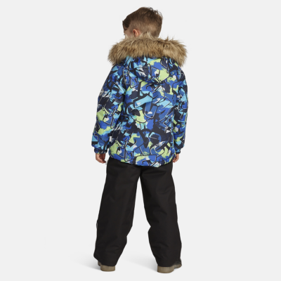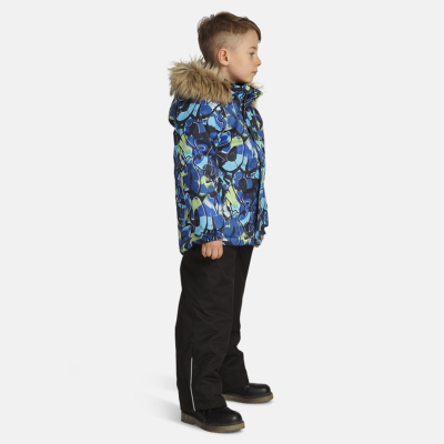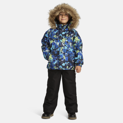 Children’s jacket and pants set. Waterproof, windproof and breathable fabric. Soft lining on the inside of the jacket and pants. Integrated elastic band at sleeve ends and on the waist. Removable snap-on hood. Faux fur trim on hood. The bib-pants have elastic adjustable suspenders. Integrated elastic band on waist. Drawstring tunnel with stoppers at leg ends. Waterproof taped seams. The pants have no inner leg seam. Reflective details on both jacket and pants.