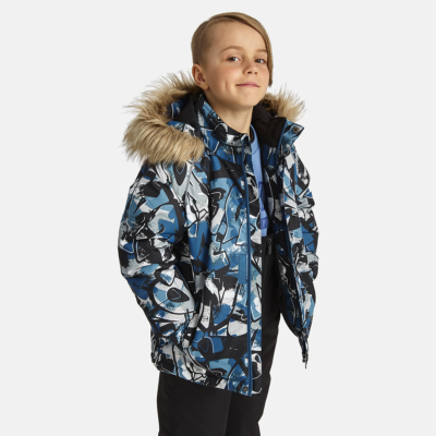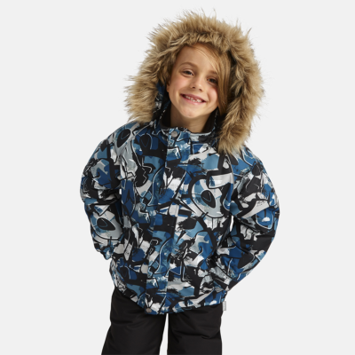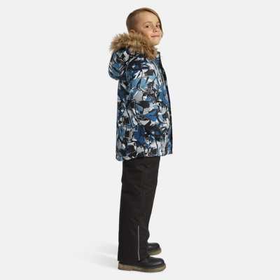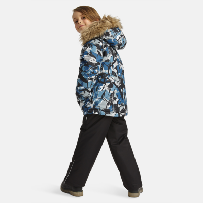 Children’s jacket and pants set. Waterproof, windproof and breathable fabric. Soft lining on the inside of the jacket and pants. Integrated elastic band at sleeve ends and on the waist. Removable snap-on hood. Faux fur trim on hood. The bib-pants have elastic adjustable suspenders. Integrated elastic band on waist. Drawstring tunnel with stoppers at leg ends. Waterproof taped seams. The pants have no inner leg seam. Reflective details on both jacket and pants.