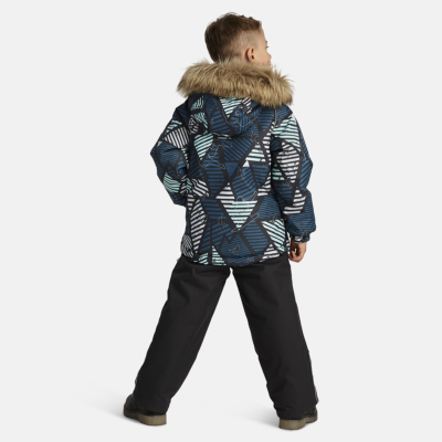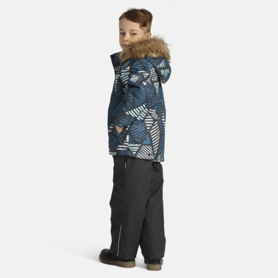 Children’s jacket and pants set. Waterproof, windproof and breathable fabric. Soft lining on the inside of the jacket and pants. Integrated elastic band at sleeve ends and on the waist. Removable snap-on hood. Faux fur trim on hood. The bib-pants have elastic adjustable suspenders. Integrated elastic band on waist. Drawstring tunnel with stoppers at leg ends. Waterproof taped seams. The pants have no inner leg seam. Reflective details on both jacket and pants.