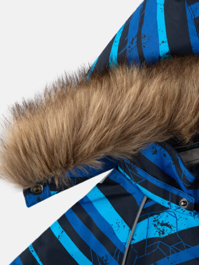 Children’s jacket and pants set. Waterproof, windproof and breathable fabric. Soft lining on the inside of the jacket and pants. Integrated elastic band at sleeve ends and on the waist. Removable snap-on hood. Faux fur trim on hood. The bib-pants have elastic adjustable suspenders. Integrated elastic band on waist. Drawstring tunnel with stoppers at leg ends. Waterproof taped seams. The pants have no inner leg seam. Reflective details on both jacket and pants.