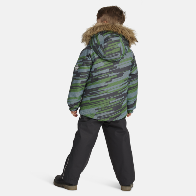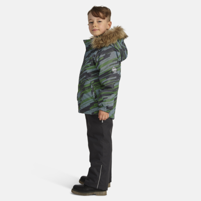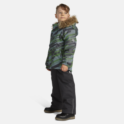 Children’s jacket and pants set. Waterproof, windproof and breathable fabric. Soft lining on the inside of the jacket and pants. Integrated elastic band at sleeve ends and on the waist. Removable snap-on hood. Faux fur trim on hood. The bib-pants have elastic adjustable suspenders. Integrated elastic band on waist. Drawstring tunnel with stoppers at leg ends. Waterproof taped seams. The pants have no inner leg seam. Reflective details on both jacket and pants.