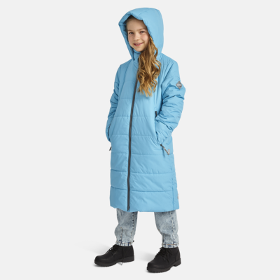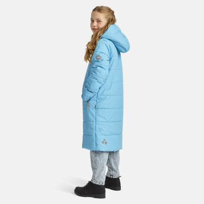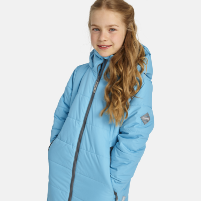 Insulated (100 g) water- and windproof between-seasons coat for girls. The top layer of the coat is breathable as well as water- and windproof. It has ribbed sleeve cuffs. The coat has a two-way zipper at the front and pockets with zippers. It is decorated with reflective details.