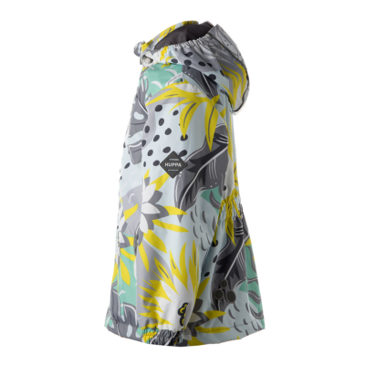 Children´s waterproof and windproof jacket. Breathable outer fabric. Rubber band incorporated in the sleeve ends, hood edge, and back waist. The removable hood attaches to the collar with press studs. Reflective details on the front and back.