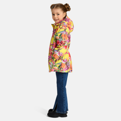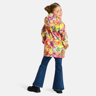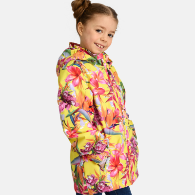 Children´s waterproof and windproof jacket. Breathable outer fabric. Rubber band incorporated in the sleeve ends, hood edge, and back waist. The removable hood attaches to the collar with press studs. Reflective details on the front and back.