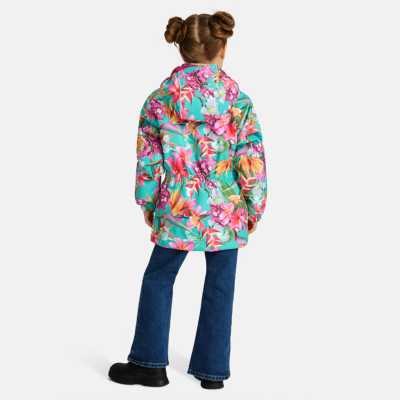 Children´s waterproof and windproof jacket. Breathable outer fabric. Rubber band incorporated in the sleeve ends, hood edge, and back waist. The removable hood attaches to the collar with press studs. Reflective details on the front and back.
