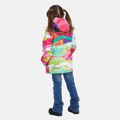 Children´s waterproof and windproof jacket. Breathable outer fabric. Rubber band incorporated in the sleeve ends, hood edge, and back waist. The removable hood attaches to the collar with press studs. Reflective details on the front and back.