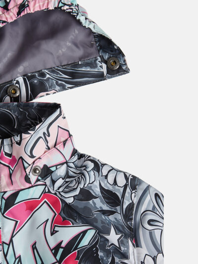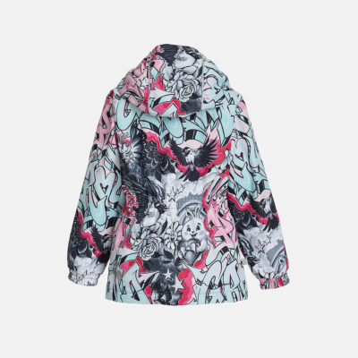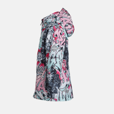 Children´s waterproof and windproof jacket. Breathable outer fabric. Rubber band incorporated in the sleeve ends, hood edge, and back waist. The removable hood attaches to the collar with press studs. Reflective details on the front and back.