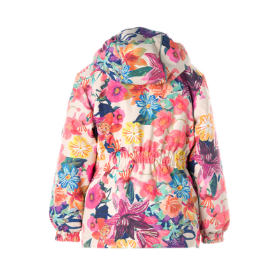 Children´s waterproof and windproof jacket. Breathable outer fabric. Rubber band incorporated in the sleeve ends, hood edge, and back waist. The removable hood attaches to the collar with press studs. Reflective details on the front and back.